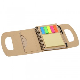 Why Choose the Color Multifunctional Notepad? Complete your desk and have it organized with this pocket-size Multifunctional Notepad. It has an unbleached natural cardboard cover and a secure domed closure. It features a 50-leaf note pad, a 25-leaf pad of adhesive notes, five different colored pads of adhesive flags, and an Eco Pen with a recycled cardboard barrel that slips neatly into the spine.
